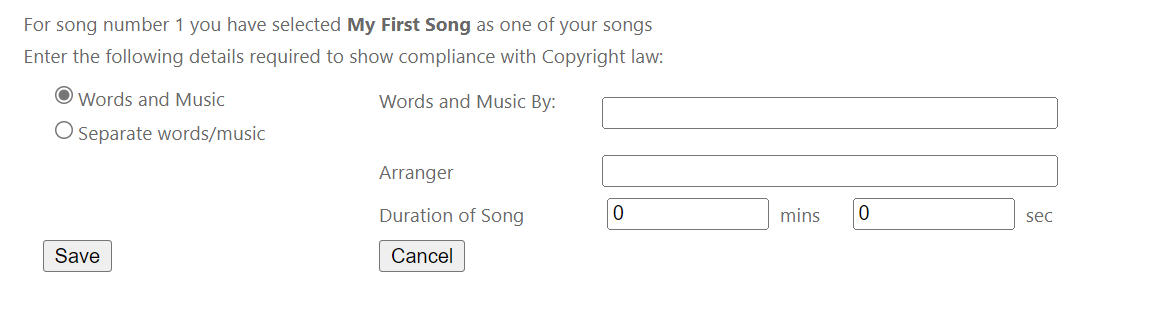 If you do select a song, you will be required to enter the names of the composer(s) and the arranger. Similarly, if you do submit the song list at this time and you are asked for a duration for the song, it will need to be entered or you will not be able to proceed. (Click on the Copyright button next to the song to get the text box for the song duration).