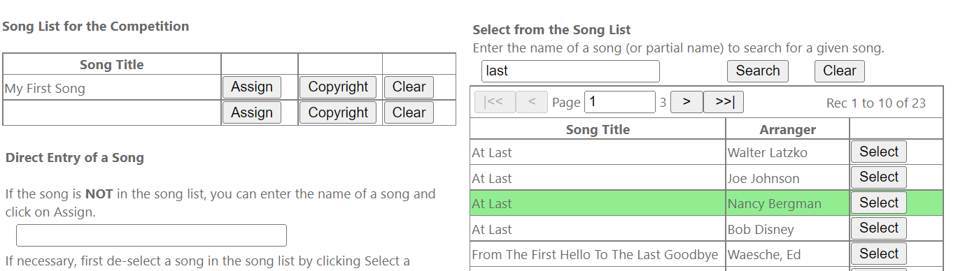 After selecting the song (ensuring you click on the appropriate arranger name if possible), click on the appropriate Assign button on the left.