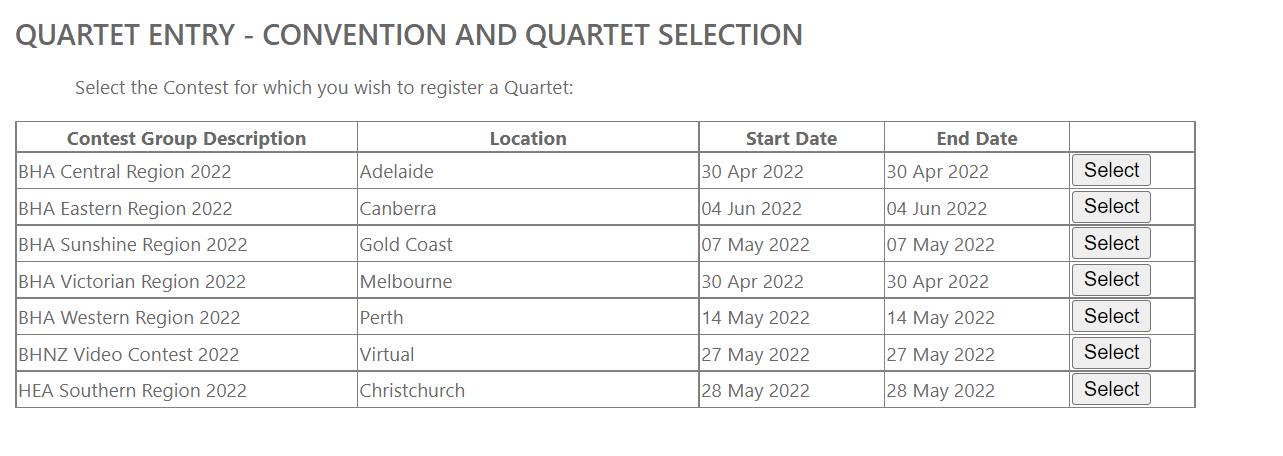 On the other hand, if you are a member of any quartet, you will get a list of the quartets of which you are a member and you can select one of these by clicking on the appropriate Select button: