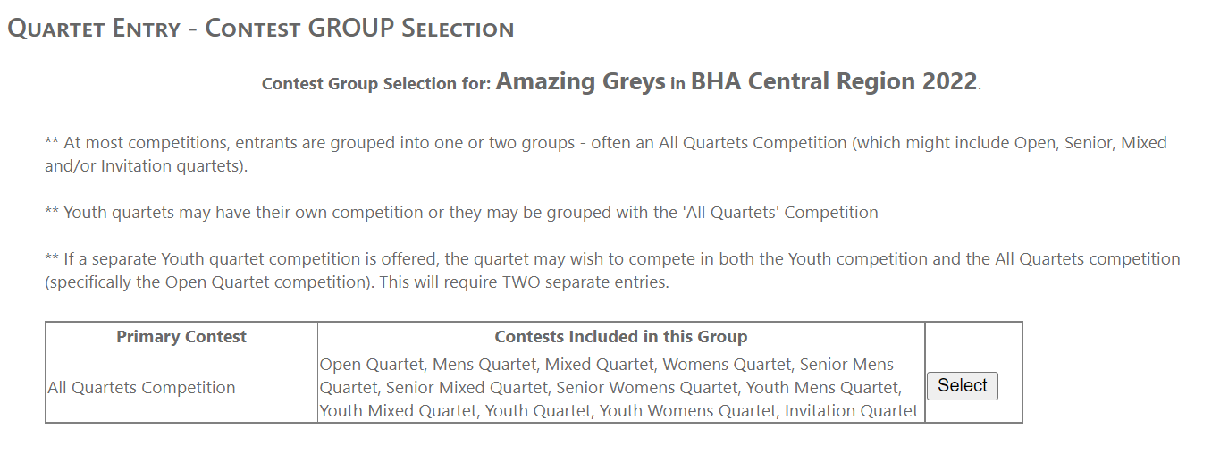 Note, as mentioned on the page, that if there is a separate Youth/Schools contest, a Youth Quartet would need to put in two separate entries, one for the Open and a second for the Youth/Schools contest if the Quartet wanted to compete in both.