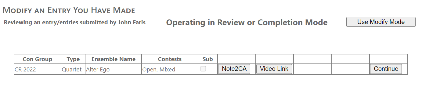 Note that the button on the top right is labelled "Use Modify Mode" and the heading states that the system is currently in "Review or Completion Mode". Completion mode refers to continuing with an entry and submitting it (although in this case the entry is complete rather than the very right button saying continue).