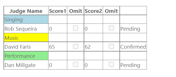 The ADM Judge can confirm a score for a scoring judge by clicking on the Confirm button next to the judges score. As has happened in this case, the score for the Music Judge has been confirmed so the button is replaced by text saying so.