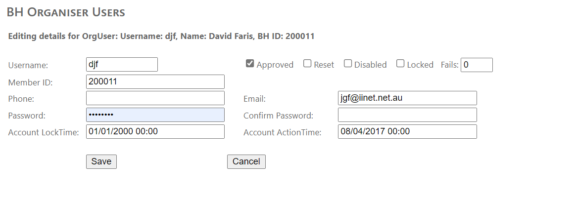 The radio buttons at the top control the order of the display and their use should be self-evident. There is the capability to search for a particular user on the basis of surname, username, email address or BHID. Partial searches are possible.