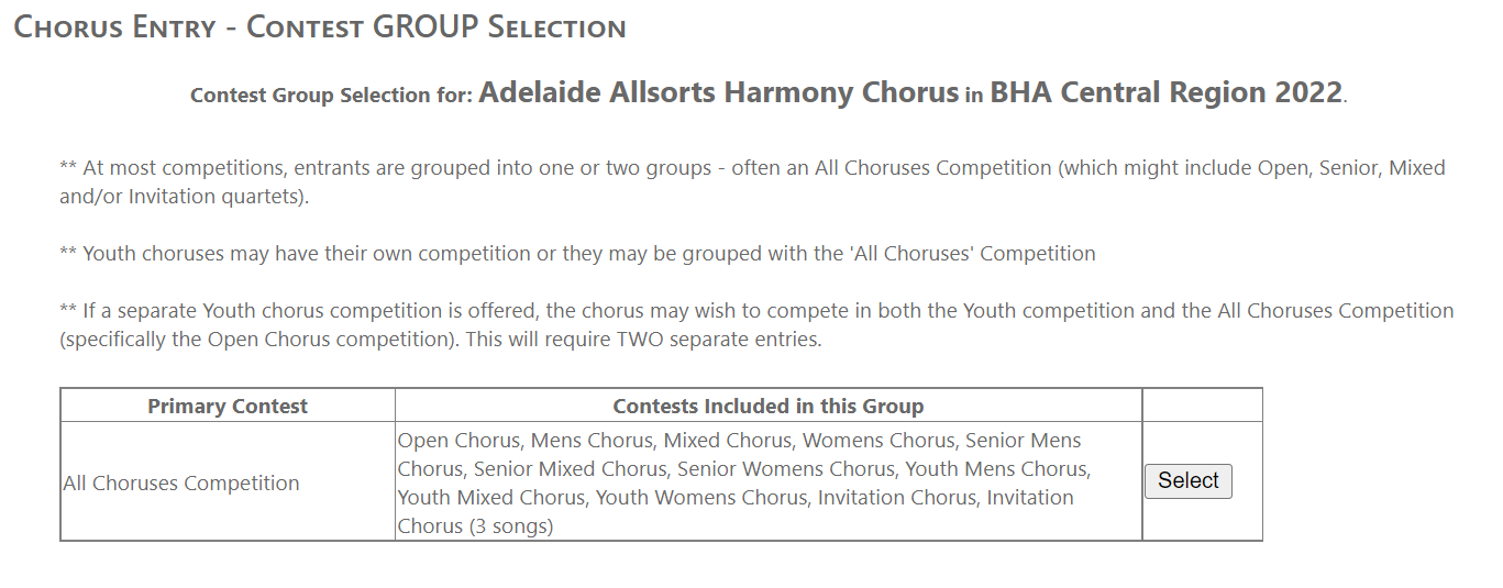 Click on the appropriate (or only) Select button to proceed to the next stage in the entry process, Selecting the Members of the Chorus.