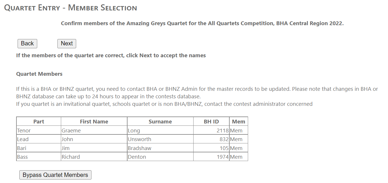 It is possible to continue with the entry and return to confirming quartet membership at a later date but no later than 10 days prior to contest. To continue with the entry at this point, click on the Bypass Quartet Members button. If the quartet members are all valid, the Bypass Quartet Members button is not enabled.