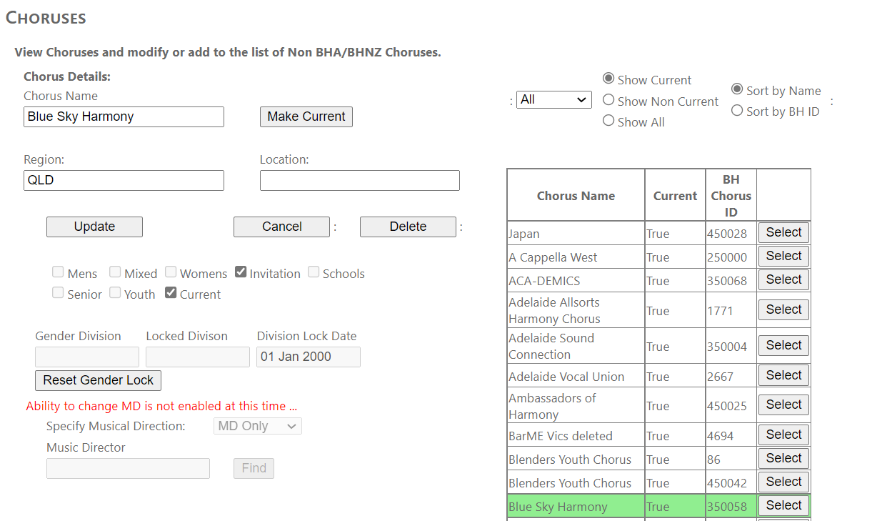 The choruses information in the contests database is, like the members, a combination of those from the BHA and BHNZ database and those added from other sources. The ensemble IDs are determined by the organisation type and have the same series of different starting numbers like the members.