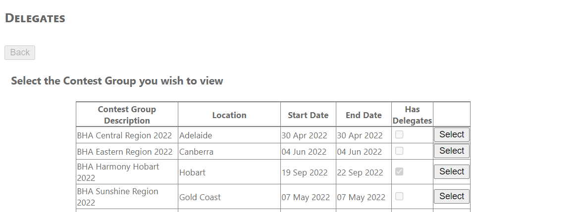 The main view and control of delegates is available in BHAdmin.  The contests website allows viewing only.  First select the national convention - normally the regionals would be well past and not show: