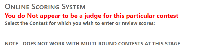If you are not a judge for the Contest Group (or later for a selected primary contest), you may get a message such as the following. (This will also occur if the ADM Judge has not yet setup the contest).