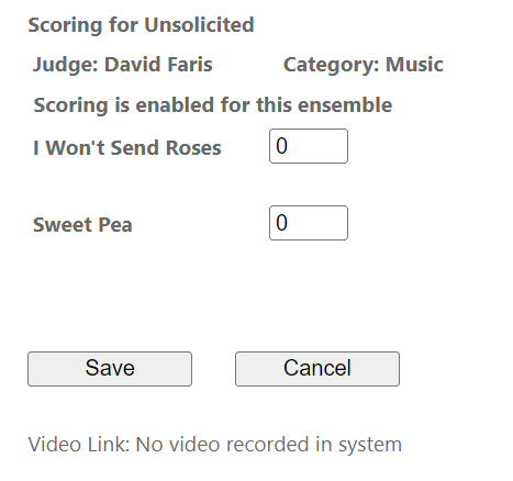 Enter the scores and click Save. (If you are on the wrong performance or don't want to save the scores, click the Cancel button).