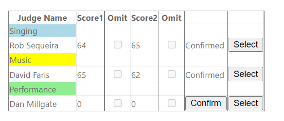 The ADM Judge can confirm a score for a scoring judge by clicking on the Confirm button next to the judges score. As has happened in this case, the score for the Music Judge has been confirmed so the button is replaced by text saying so.