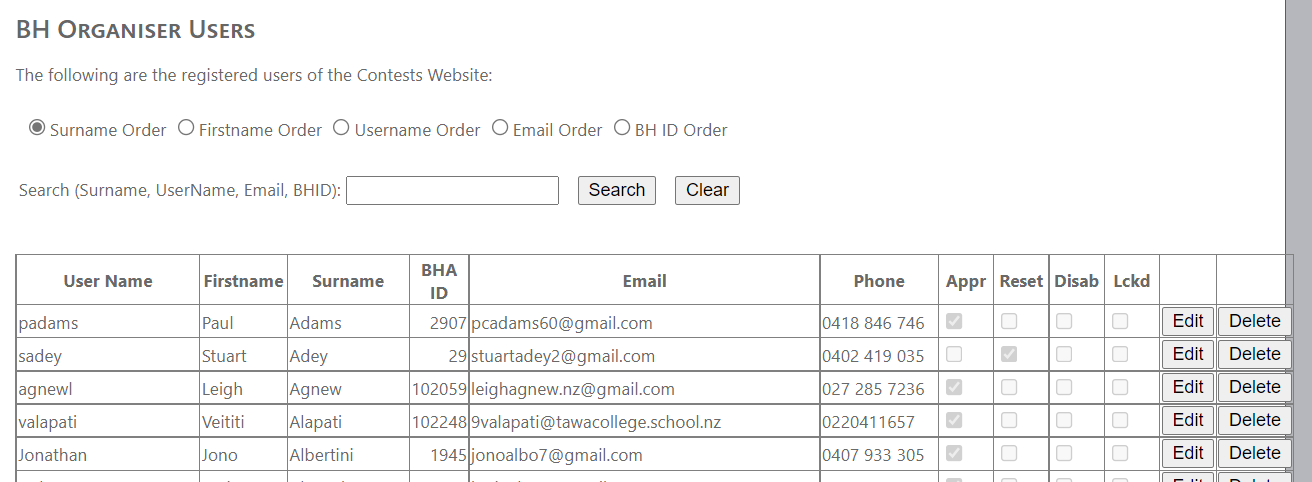 The radio buttons at the top control the order of the display and their use should be self-evident. There is the capability to search for a particular user on the basis of surname, username, email address or BHID. Partial searches are possible.